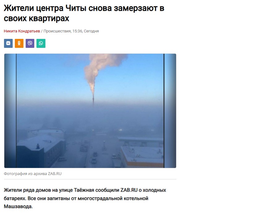 Как сообщают местные СМИ, утром 7 января тысячи жителей города остались без тепла и горячий из-за аварии на котельной бывшего Машиностроительного завода. Ситуация усложняется тем, что в эти дни температура воздуха в Чите достигает -20 градусов.