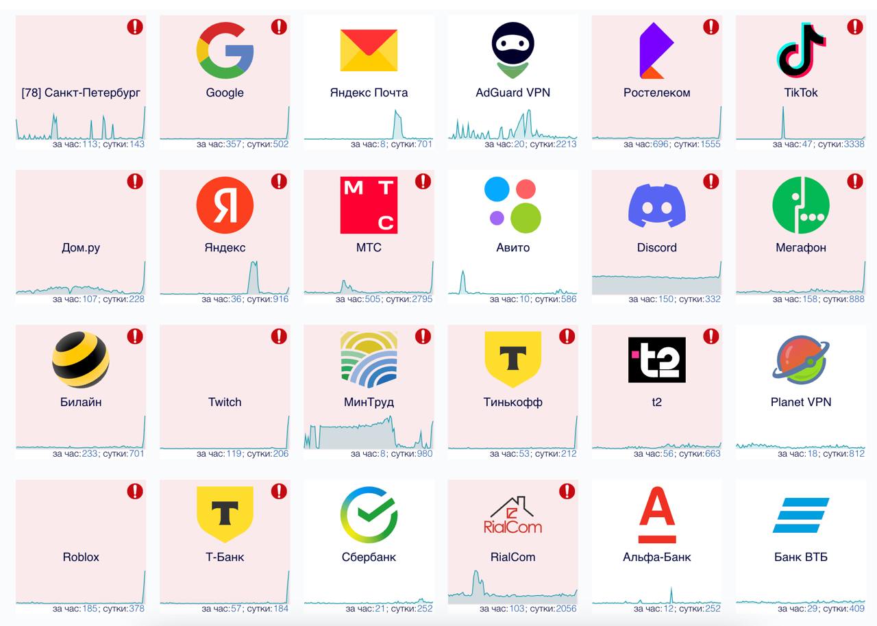Сообщения о неполадках начали поступать в 17:09 по московскому времени. В ходе сбоя прекратили функционировать: