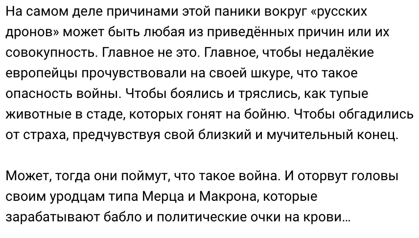 Однако основной посыл Медведева вызывает тревогу: он открыто радуется страху европейцев, заявляя, что это поможет им "почувствовать на своей шкуре опасность войны". По его словам, жители ЕС должны "бояться и трястись", как "тупые животные", и в итоге свергнуть лидеров вроде Эммануэля Макрона и Фридриха Мерца, которых он также жестко оскорбляет. Это заявление подчеркивает агрессивный тон официальной российской риторики и фактически подтверждает причастность РФ к "дроновой эпидемии" вопреки заявлениям диктатора Путина.