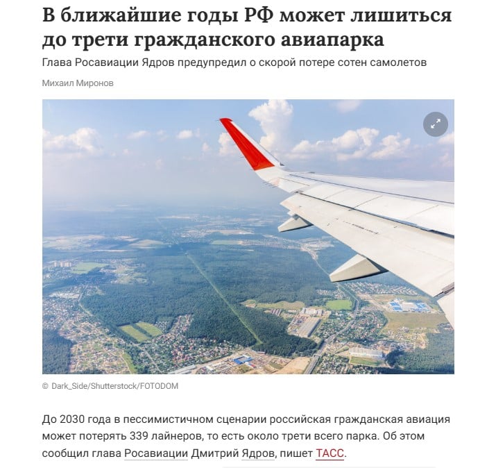 Потерю сотен самолетов прогнозируют и в Росавиации. Глава агентства Дмитрий Ядров, слова которого приводят российские СМИ, заявил, что в пессимистичном сценарии гражданская авиация РФ к концу десятилетия лишится 339 лайнеров.