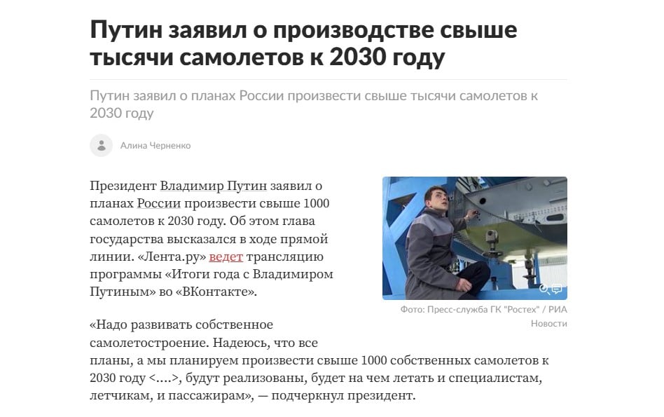 При этом в 2023 году российский диктатор Владимир Путин обещал выпуск свыше 1000 самолетов к 2030 году. Однако на деле +1000 самолетов может превратиться в минус сотни лайнеров.