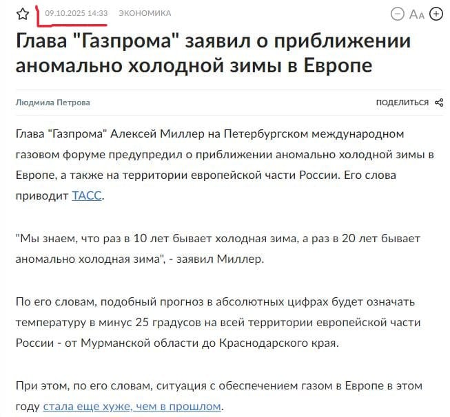 К слову, ранее Миллер уже прогнозировал "апокалипсис" Европе. В октябре 2022 года он заявлял, что без российского газа "могут замерзнуть целые европейские города", но с тех пор замерзли только финансы "Газпрома".
