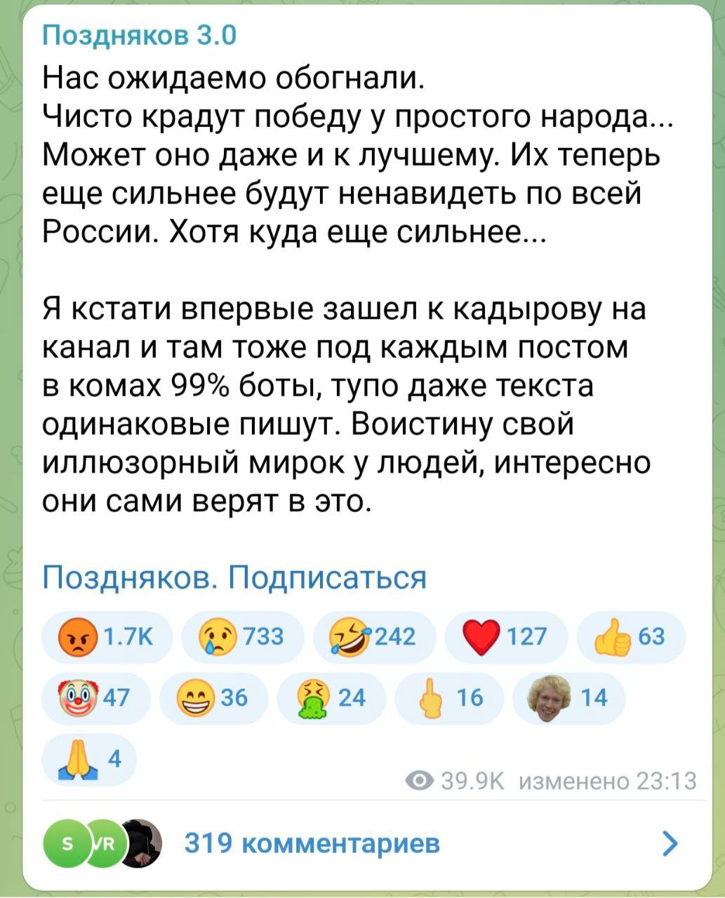 Представители Z-сообщества и российских ультрапатриотов, для которых национальная принадлежность имеет культовый характер, восприняли это как личное оскорбление. Один из известных Z- пропагандистов Позняков пожаловался, что он не может купить накрутку за вариант, который ему нравится, потому что все эти ресурсы уже куплены "кадыровцами".