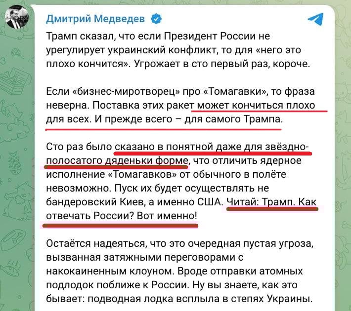 Бывший президент и премьер России Дмитрий Медведев опубликовал оскорбительные и угрожающие высказывания в адрес Дональда Трампа, обвинив его в "попытках втянуть США в войну" и намекнув, что ответ России может быть "фатальным". Судя по тональности, возможность передачи Украине крылатых ракет "Томагавк" с радиусом поражения в несколько тысяч километров серьезно напугала Москву.