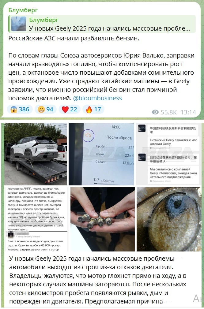 Компания Geely Motors первой официально признала: российский бензин стал причиной поломок двигателей у машин Monjaro, Tugella и Coolray. Исследования показали, что уровень оксидантов (побочного продукта переработки нефти) в российском топливе существенно выше, чем в китайском.