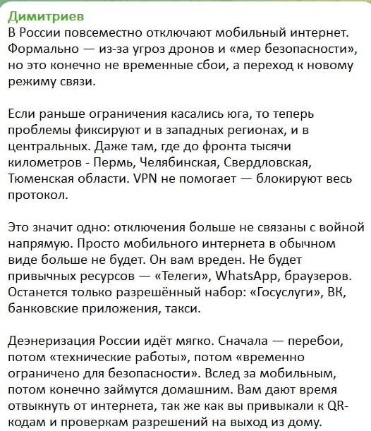 "VPN не помогает — блокируют весь протокол. Это значит одно: отключения больше не связаны с войной напрямую. Просто мобильного интернета в обычном виде больше не будет. Он вам вреден", — написал Димитриев.