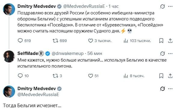 Один из пользователей соцсети решил оставить комментарий под постом Медведева, предложив испытать "Посейдон" на Бельгии. "Тогда Бельгия исчезнет", — кратко ответил зампред Совбеза РФ.