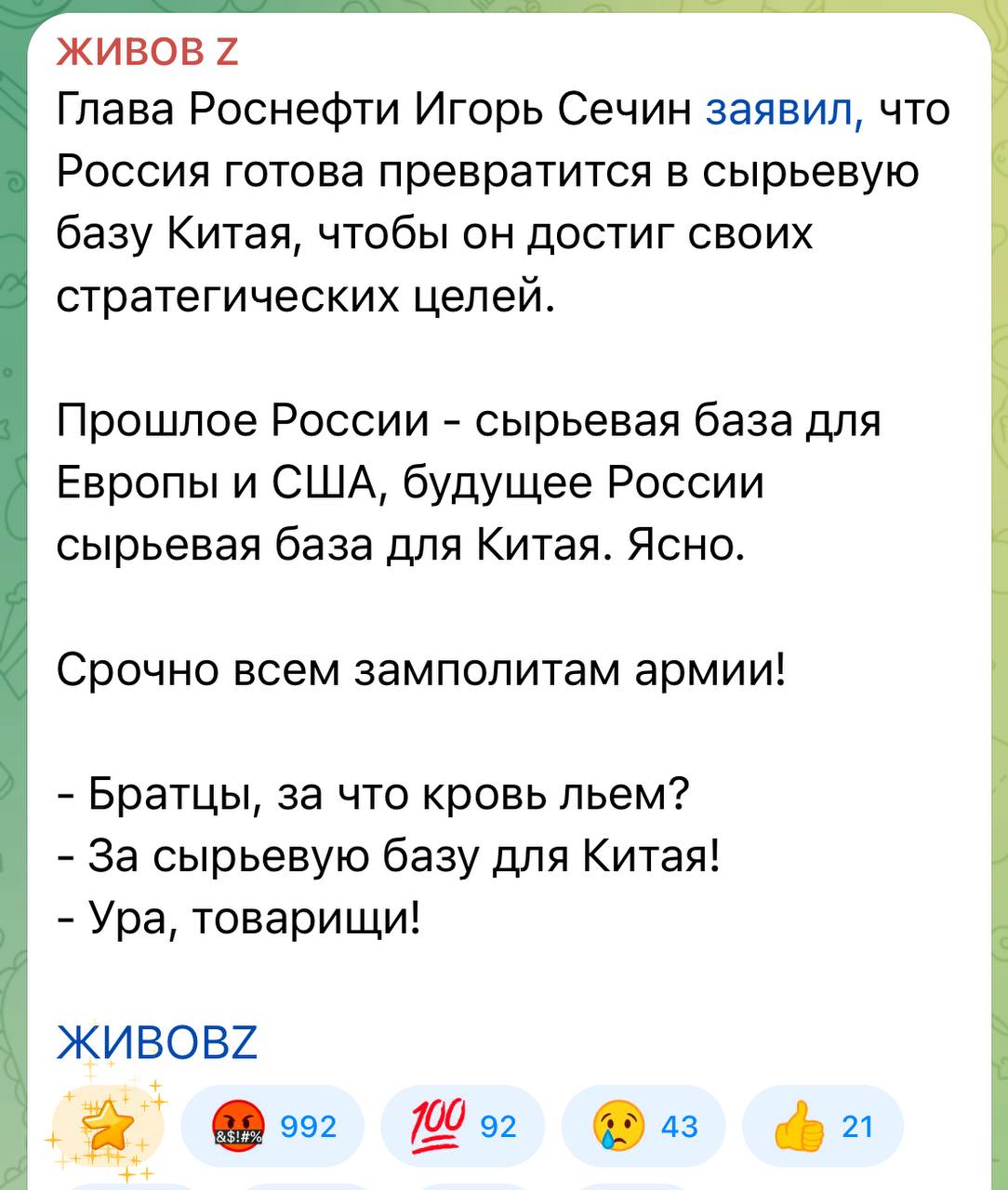 Сечин подчеркнул, что Пекин производит 35% мировой промышленной продукции, а зависимость технологических гигантов США от китайских комплектующих уже втрое выше, чем зависимость самого Китая от американских товаров. Такое признание выглядит показательным: ближайшее окружение Путина видит Россию не как самостоятельного игрока, а как сырьевую базу для КНР и делает это публично.