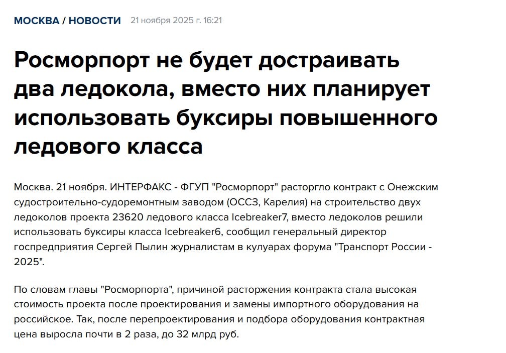 РосСМИ приводят заявление руководства предприятия, которое отмечает, что контрактная стоимость судов после перехода на отечественные комплектующие выросла почти вдвое – до 32 млрд рублей. В таких условиях реализация проекта стала невозможной.