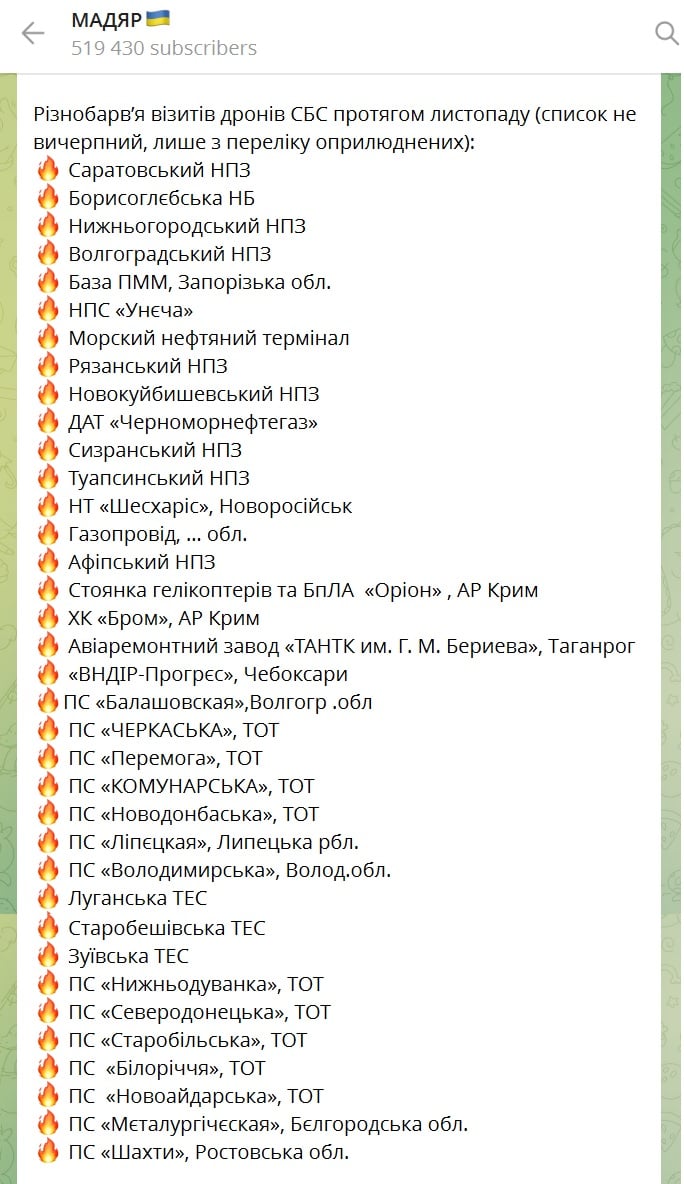 В ноябре украинские "Птахи" Мадяра провели рекордное число ударов вглубь России: 108 боевых вылетов и 88 пораженных объектов от НПЗ и терминалов до подстанций и ТЭС.