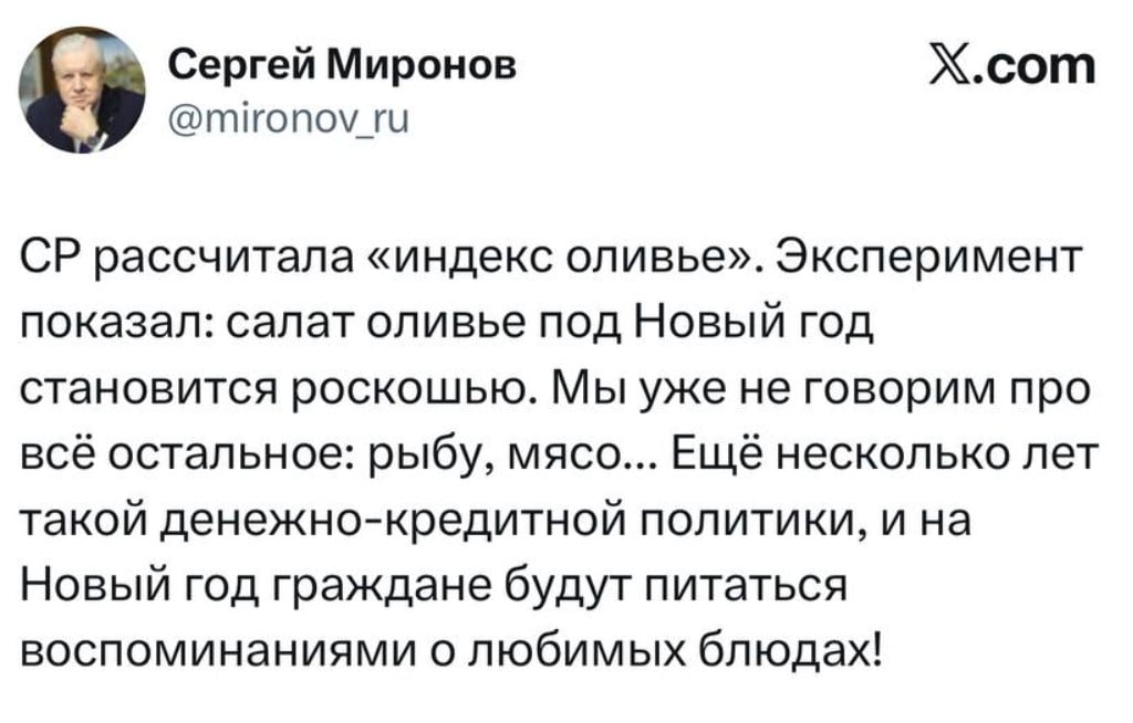 В этом же посте Миронов посетовал: если нынешняя кредитно-денежная политика в РФ сохранится еще несколько лет, то россиянам придется окончательно забыть о новогодних блюдах и жить лишь одними воспоминаниями.