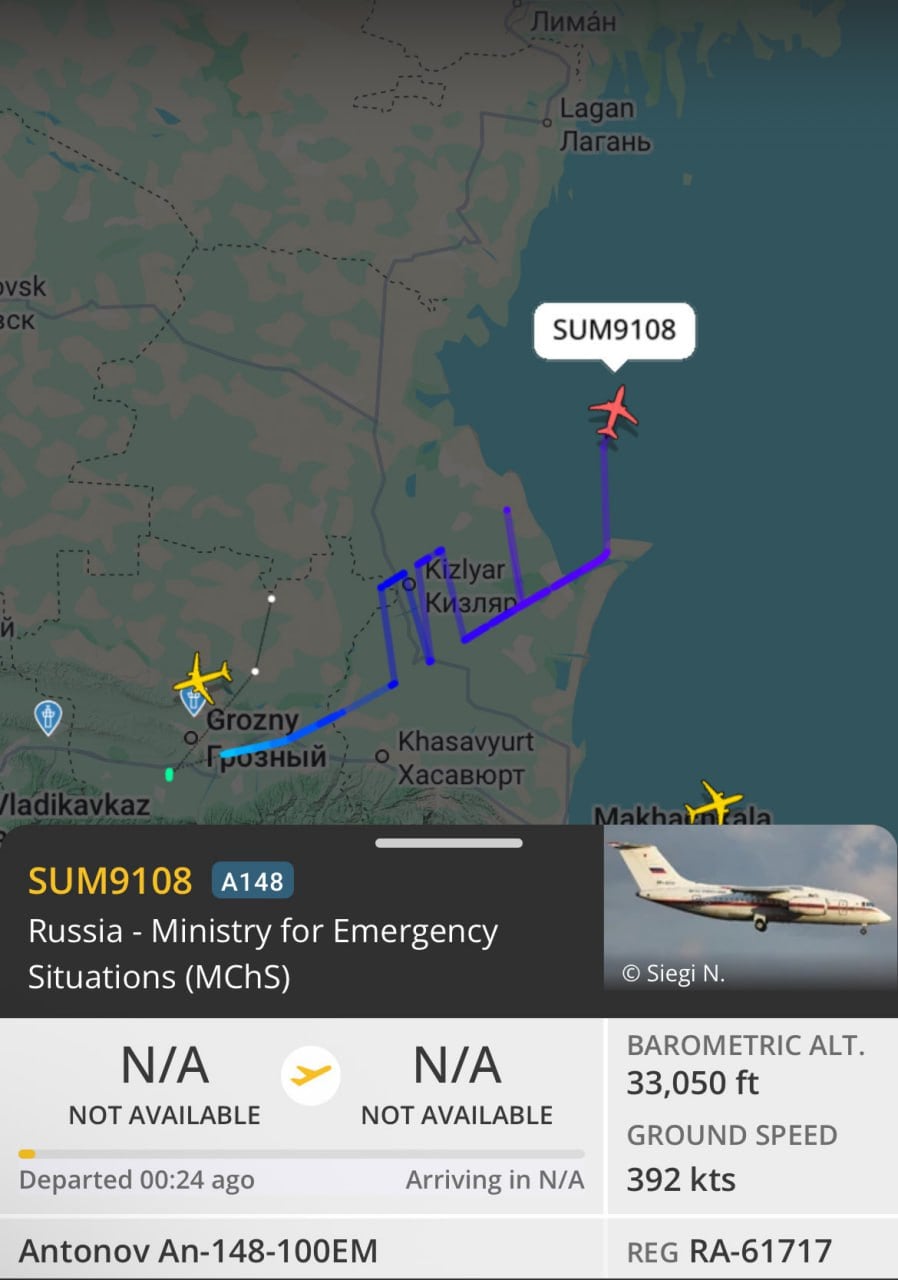Тем временем, согласно данным сервиса Flightradar, из Грозного в Москву в пятницу вечером вылетел самолет "Ан-148-100ЕМ", используемый МЧС РФ в качестве "летающего госпиталя". Судно пролетало над Каспийским морем.