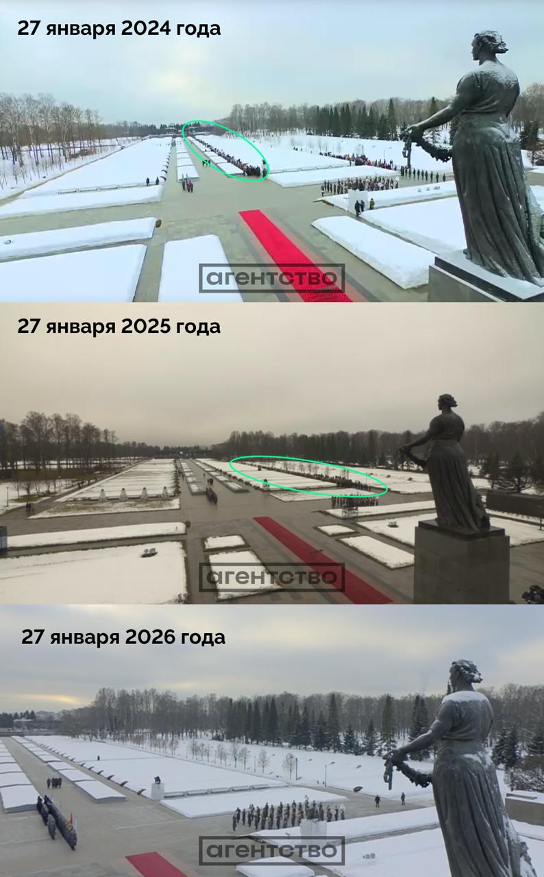 В "Агентстве" показали, как Владимир Путин постепенно отгораживался от народа: в 2024 году зрители занимали боковую дорожку центральной аллеи, уже в 2025-м их отодвинули на дальнюю аллею между братскими могилами расстояние до президента увеличилось на 25 метров (с 10 до 35), сегодня - убрали вовсе.