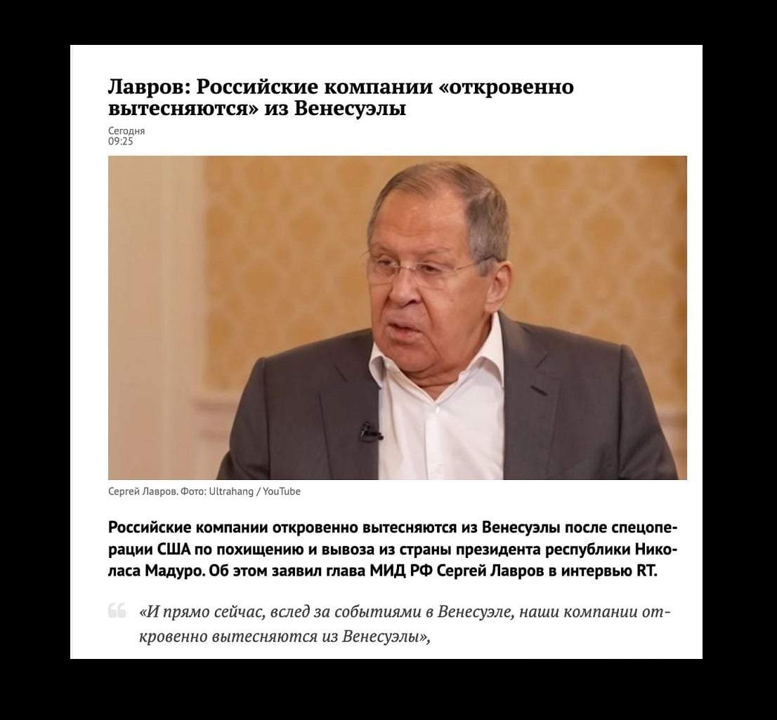 Лавров прямо признал, что российские компании пытаются убрать с венесуэльского рынка. Он подчеркнул, что происходящее связано с общей геополитической ситуацией вокруг Венесуэлы и борьбой за влияние в регионе.