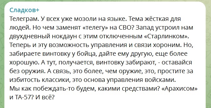 Военный корреспондент Александр Сладков фактически признал системную проблему. В эмоциональной форме он усомнился, какими средствами Россия собирается воевать при деградации каналов связи. Его комментарии, выдержанные в саркастическом тоне, отражают растущее раздражение даже внутри провластного лагеря.