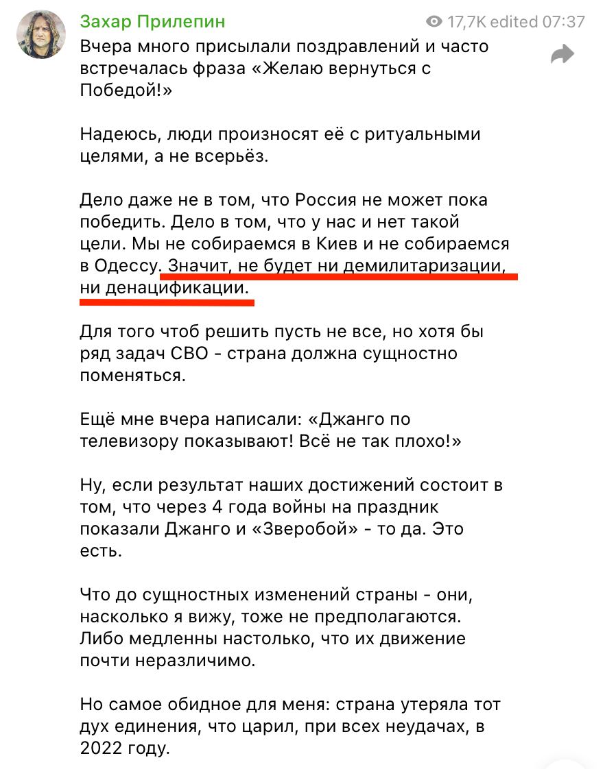 Более того, Прилепин пишет, что Россия "утеряла тот дух единения, что царил при всех неудачах в 2022 году".