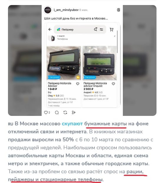 С 6 по 10 марта, по данным сети Wildberries, продажи пейджеров в Москве выросли на 73%, раций на 27%, домашних телефонов на 25%. Одновременно увеличился спрос на бумажные атласы и путеводители по городу на 48% - вместе с Интернетом пропала возможность передвигаться по онлайн-картам по городу.
