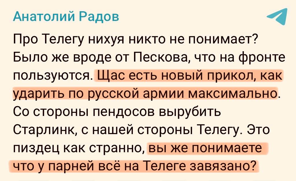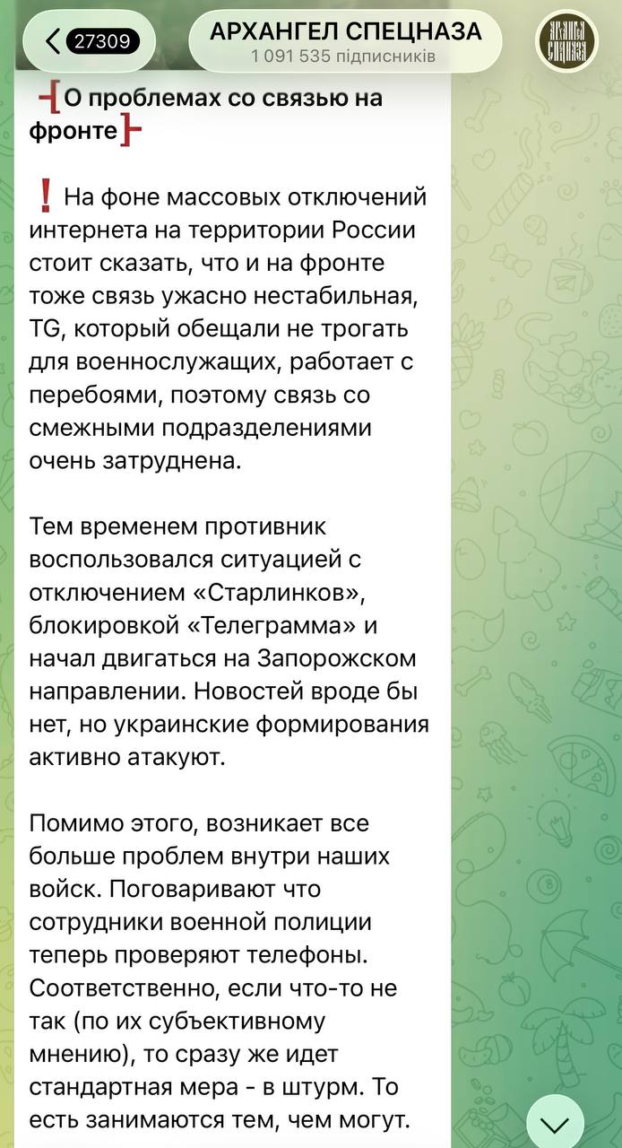 Российские Z-блогеры сообщают о серьёзных проблемах со связью на фронте. По их словам, Telegram и Интернет либо полностью "легли", либо работают с перебоями, что осложняет сильно координацию между подразделениями. Более того, связность фронта у российских оккупантов резко упала и зачастую даже соседние подразделения не могут контактировать между собой, порождая хаос на фронте.