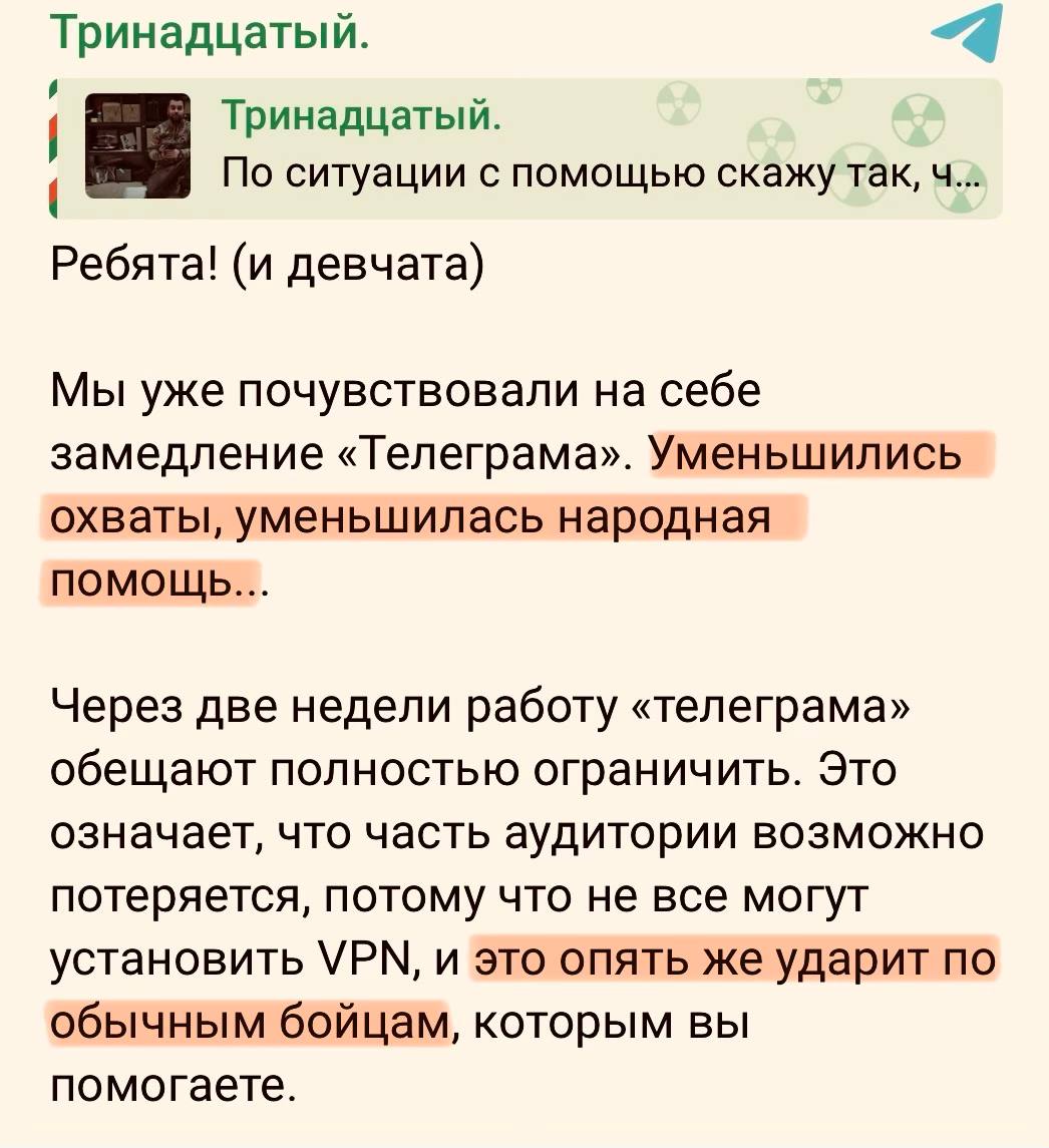 Одновременно фиксируется снижение волонтёрской помощи, которая во многом организовывалась через Telegram. Через мессенджер собирались средства и координировались поставки помощи для подразделений. Теперь на фронт поступает намного меньше экипировки и дронов, за счёт которых во многом держалась российская армия.