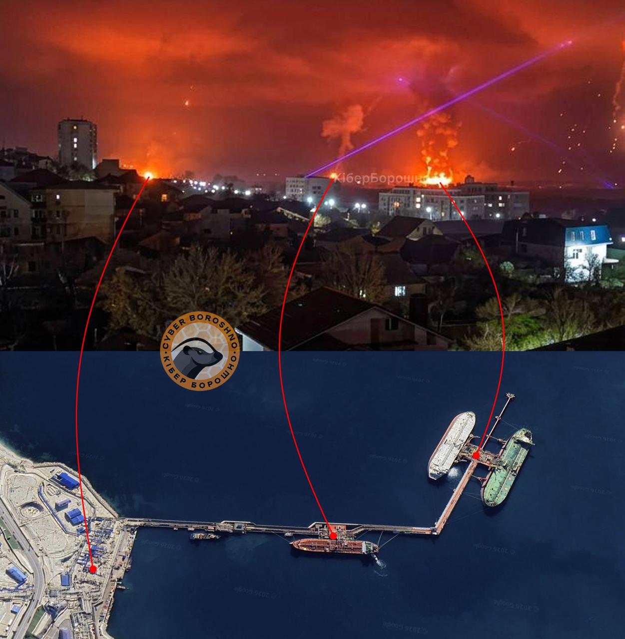 По данным OSINT-аналитиков "КіберБорошно", удары пришлись по трем ключевым объектам: причалам №1 и №2, а также узлам системы измерений количества и качества нефти (СИКН). На причале №1 зафиксирован масштабный пожар, вызванный разливом нефти.