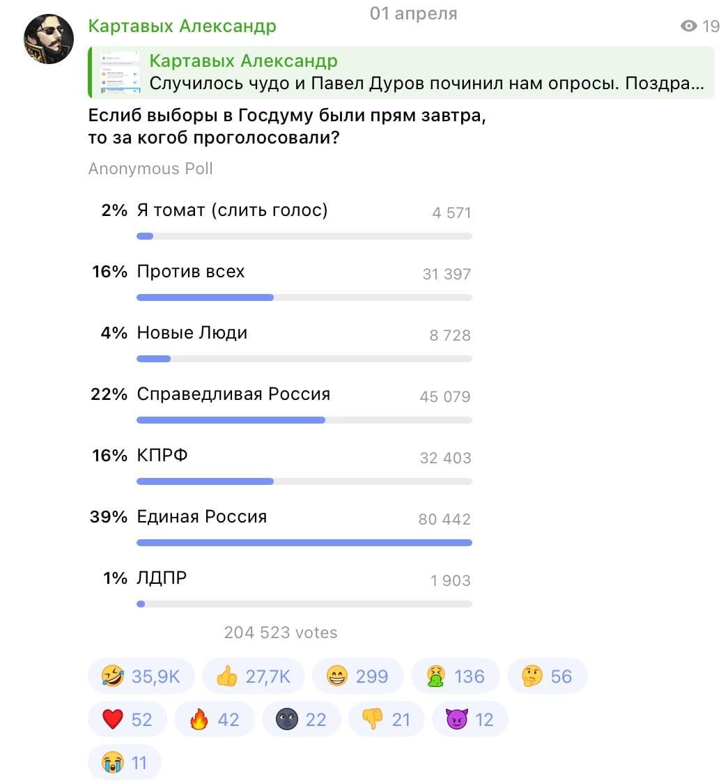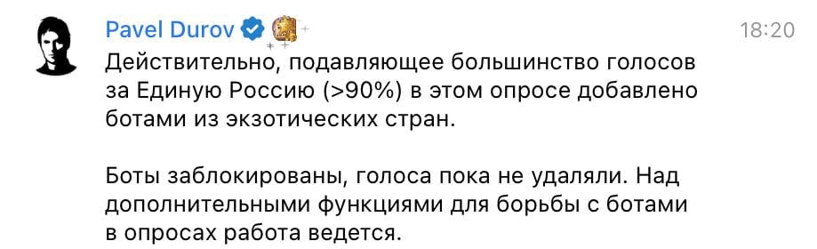 Однако позже в обсуждение неожиданно вмешался Дуров. Он написал в комментариях под голосованием, что подавляющее большинство голосов за правящую партию было добавлено с помощью ботов.