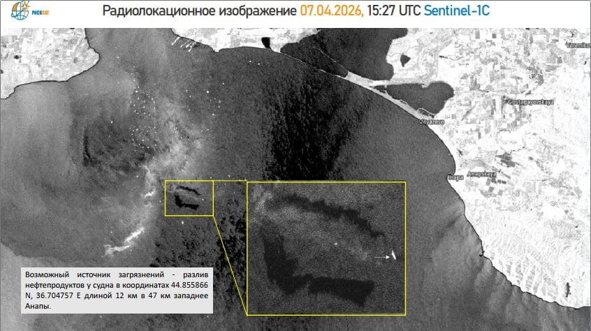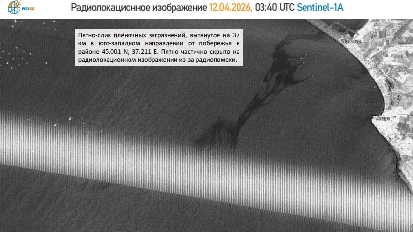 Пятно вытянулось примерно на 40 км и уже достигло побережья. Спутниковые данные показывают, что загрязнение дрейфовало несколько дней под воздействием ветра, постепенно приближаясь к береговой линии.