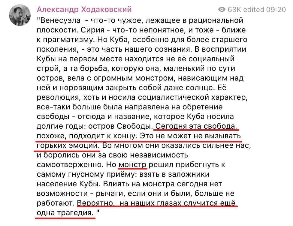 В публикации Ходаковский сравнил Кубу с Венесуэлой и Сирией, назвав ее особым символом для старшего поколения. При этом он дал понять, что Москва уже не способна повлиять на развитие ситуации. По его словам, прежние рычаги давления больше не работают.