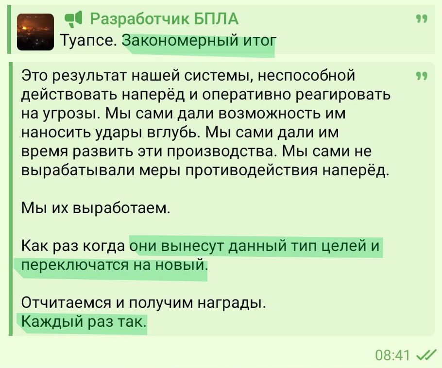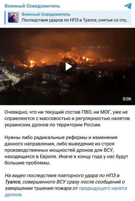 Российские военные пропагандисты и Z-блогеры выступили с резкой реакцией на серию ударов Украины по объектам в глубоком тылу России. Поводом стали новые атаки, в том числе по нефтеперерабатывающему заводу в Туапсе, кадры последствий которых быстро распространяются в соцсетях.
