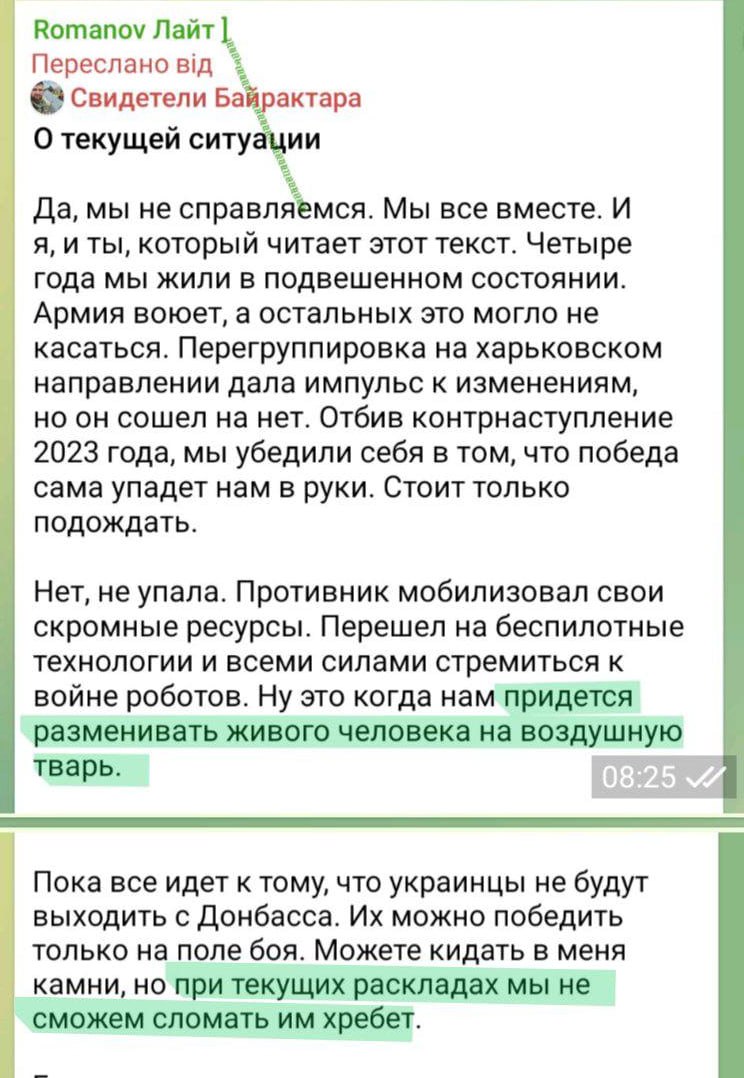 Сообщения последовательно появились в трех Telegram-каналах с аудиторией в сотни тысяч: военкор Романов, "Разработчик БПЛА", "Военный осведомитель".
