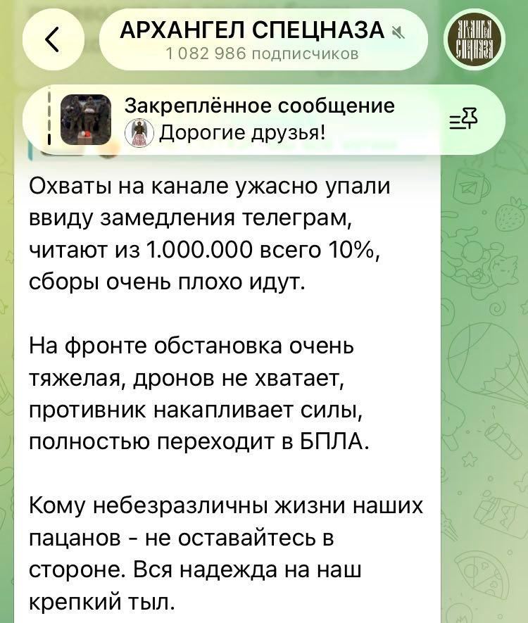Кремлевские блокировки Telegram и Интернета в целом "убили" охваты Z-каналов: миллионник "Архангел спецназа" читают только 10% подписчиков, а сборы на фронт рухнули.