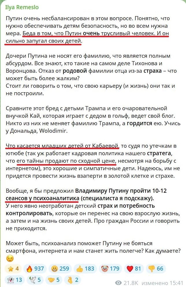 В своем новом посте Ремесло назвал Путина "трусливым человеком" и обвинил его в том, что он "запугал собственных детей". Он также высмеял тот факт, что дочери Путина не живут публичной жизнью под его фамилией, а прячутся под чужими именами, хотя "все все знают".