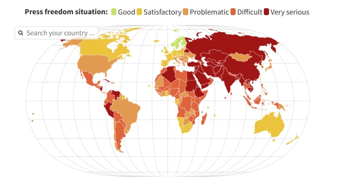 Свобода прессы в мире рухнула до минимума за всю историю индекса. Впервые более половины стран (52,2%) попали в категории "сложно" или "очень серьезно", тогда как в 2002 году таких было всего 13,7%. Доля населения мира, живущего в странах с "хорошей" ситуацией со свободой прессы, упала с 20% до менее 1%, теперь это только семь стран Северной Европы.