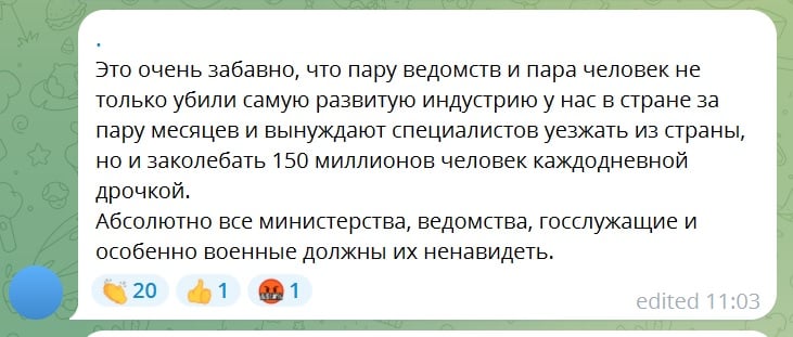 "Пара человек не только убила самую развитую индустрию у нас в стране за пару месяцев и вынуждает специалистов уезжать из страны... Абсолютно все министерства, ведомства, госслужащие и, особенно, военные должны их ненавидеть", - пишет один из комментаторов.