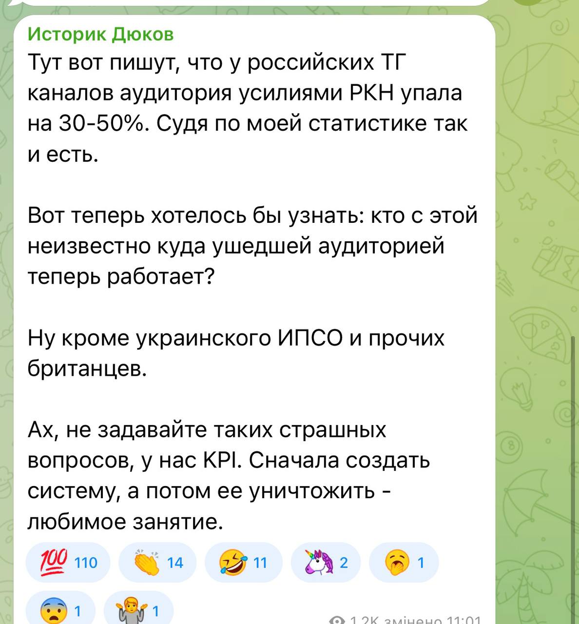 Пропагандист Александр Дюков отмечает, что аудитория "исчезла" после действий российских властей, а последствия уже отражаются на охватах и донатах. Внутри провоенного сегмента растет недовольство решениями, которые подрывают информационную инфраструктуру РФ.