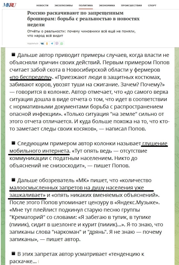 В качестве примеров приводятся массовый забой скота в Новосибирской области без понятных разъяснений, отключения мобильного Интернета и цензура песен на стриминговых сервисах. Автор пишет, что число запретов растет, а объяснений со стороны государства нет.