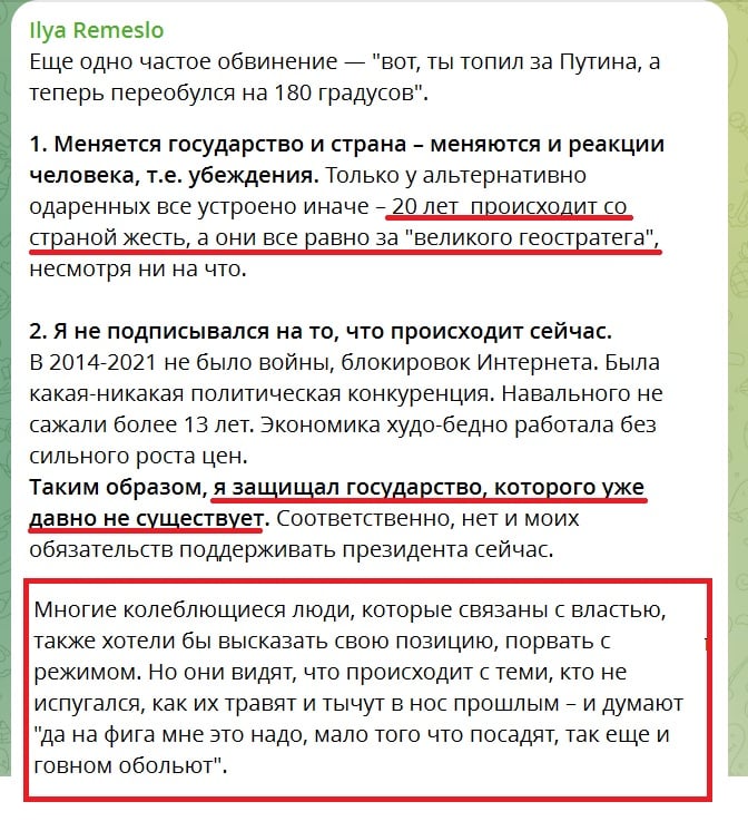 После выписки из психиатрической клиники за резкую критику Путина российский пропагандист Илья Ремесло продолжил критику режима и опубликовал новен заявление в своем Telegram-канале, где фактически объяснил разрыв с прежней позицией поддержки власти.