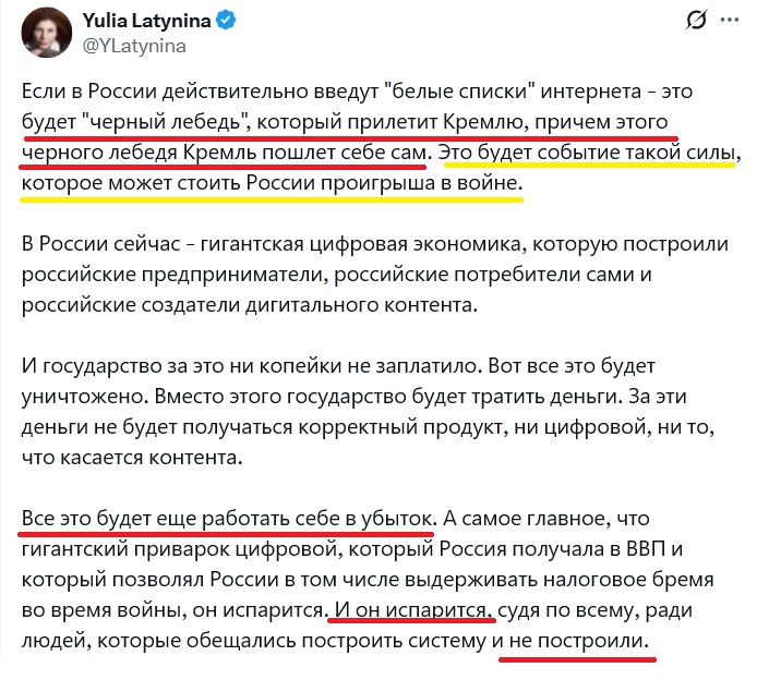 Латынина заявила, что в случае введения "белых списков" Россия получит "черного лебедя", которого Кремль отправит себе сам. По ее словам, последствия могут оказаться настолько сильными, что это может сказаться на способности России продолжать войну.