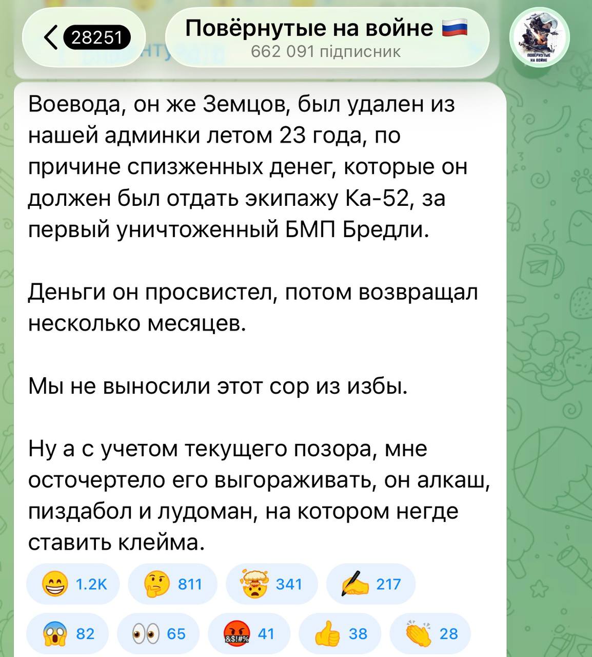 Канал "Повернутые на войне", где Земцов раньше был в администраторах, заявил, что его выгнали еще летом 2023 года из-за присвоенных денег. Выяснилось, что он забрал средства, которые должен был передать экипажу Ка-52 за уничтожение Bradley, а потом возвращал их месяцами.