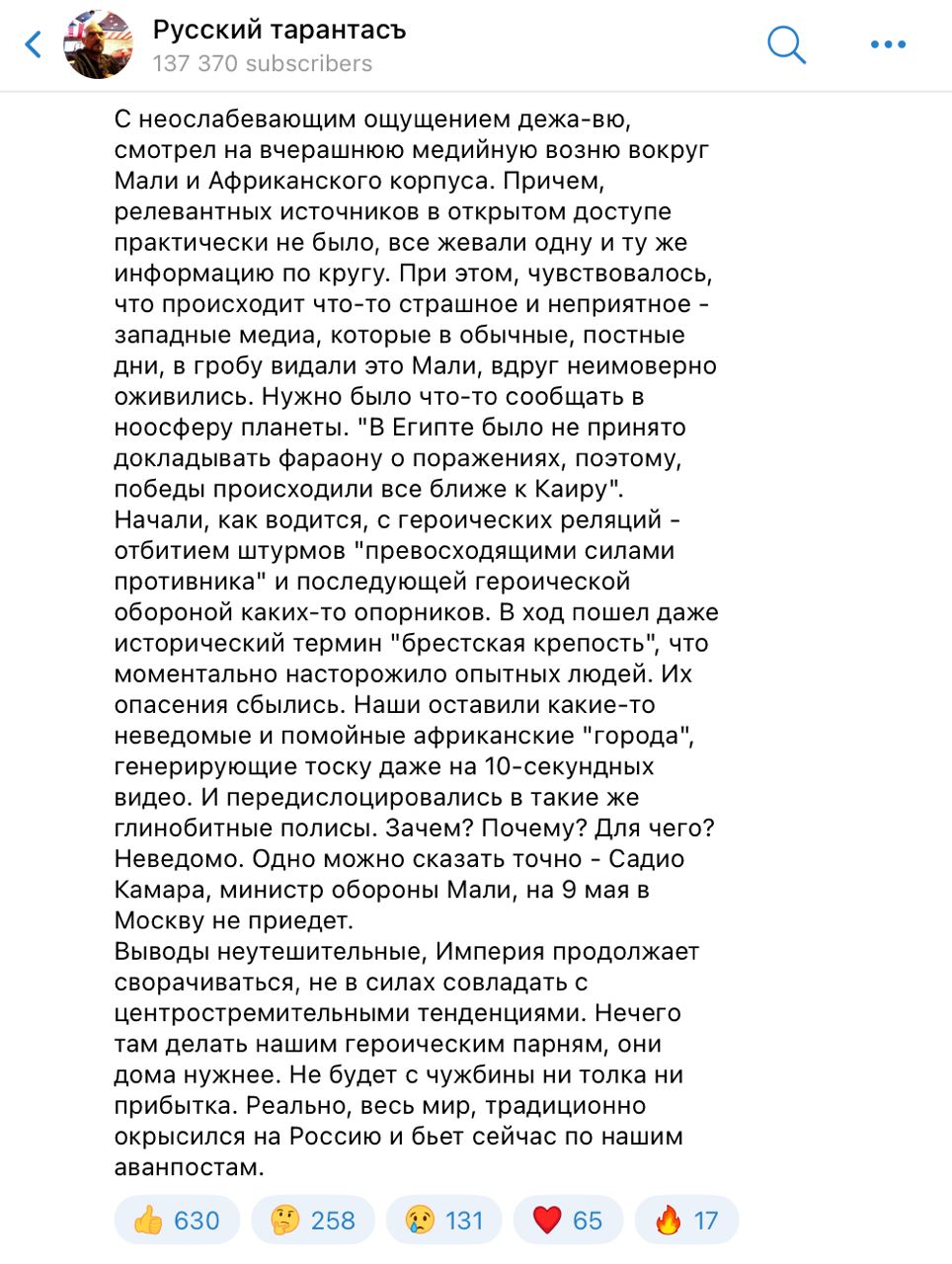 Пока Кремль хранит молчание о провале в Мали, российские военные блогеры говорят то, что официальные СМИ сказать не могут. Военный корреспондент Дмитрий Стешин в своем Telegram-канале "Русский тарантасъ" подвел итоги бегства "Африканского корпуса" из Кидаля без прикрас.