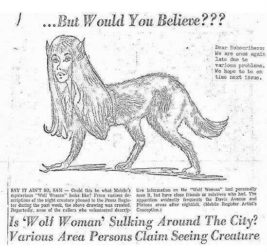 Выяснилось, что волчица-женщина обитала в штате Алабама на юге США. Причем, передняя часть у нее была человеческой, зато задняя точь-в-точь как у животного. При этом, дьявольское создание обладало способностью ходить как человек на двух ногах, или, по мере необходимости, бегать по-волчьи, на четырех.