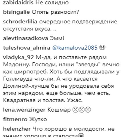 "Очень вызывающе, ну просто, как проститутка со стажем", "Фу, мопс престарелый", "И не стыдно? Такая женщина умная, а начала до быдлопугачихи опускаться. Кому интересно на старческую грудь смотреть?" "Зачем этот мамон так подчеркивать? Брюхо отъела конкретно!" – пишут возмущенные внешним видом Долиной пользователи.