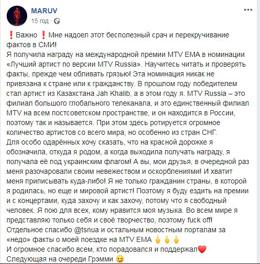 "Хватит меня приписывать куда-либо! Я не только гражданин страны, в которой я родилась, но еще и мировой артист! Поэтому я буду ездить на премии и с концертами, куда захочу и как захочу, потому что я свободный человек. Я пою для всех, кому нравится моя музыка. Во всем мире я представляю только себя и свое творчество, поэтому fu*k off!" - эмоционально закончила свой пост MARUV.