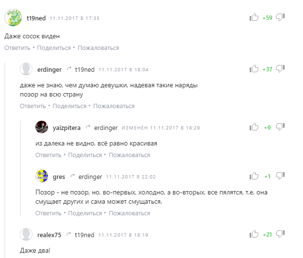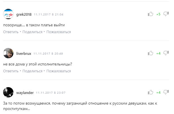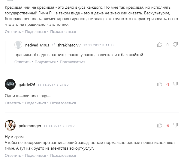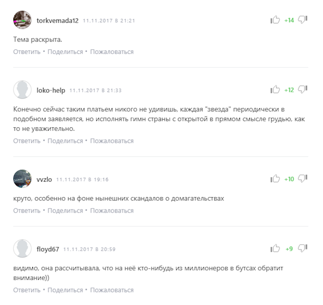 Россияне в Интернете пишут, что инцидент выглядит крайне неприлично и может обернуться позором для России. Люди отмечают, что исполнение гимна является большой привилегией, а неудачный выбор платья может поставить под сомнение репутацию всей страны.