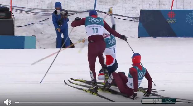 Россия снова лишилась медалей в Пхенчхане: российские лыжники упали в самом начале старта гонки и не смогли выбраться из "завала" - кадры