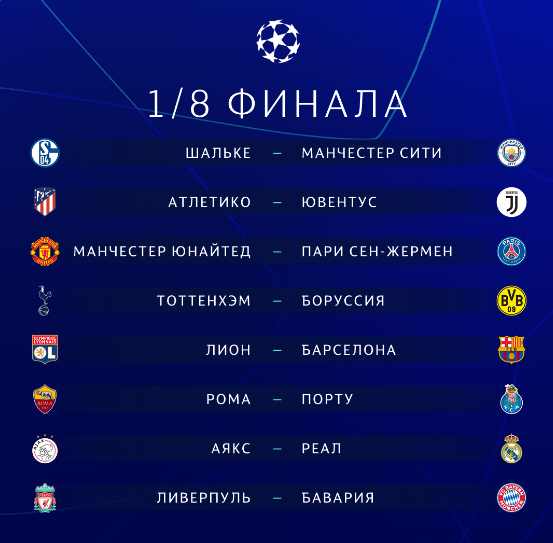 Первые поединки этой 1/8 пройдут 12-13 февраля и 19-20 февраля, а ответные - 5-6 и 12-13 марта.