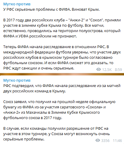 Отмечается, что "Анжи-2" и "Сокол" приехали на территорию аннексированного полуострова в 2017 году и провели ряд матчей в "Кубке Крыма". Напомним, что футбольные организации FIFA и UEFAне признают Крым российской территорией с 2014 года.