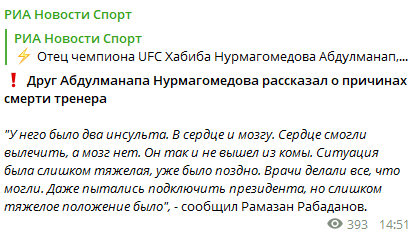 Абдулманап Нурмагомедов, известный российский тренер и отец российского бойца смешанного стиля (ММА) Хабиба Нурмагомедова скончался из-за последствий мозгового инсульта. Нурмагомедов, которому было 57 лет, перенес два инсульта - сердечный и мозговой, сообщает Диалог.UA со ссылкой на Российский Диалог.