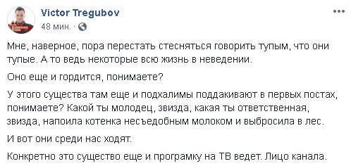 Журналист Виктор Трегубов возмущается не только поступком ведущей, но и тем, что многие в комментариях Гончарову поддержали: