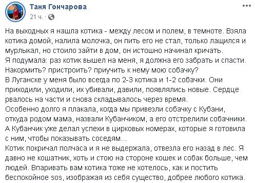 "На выходных я нашла котика - между лесом и полем, в темноте. Взяла котика домой, налила молочка, он пить его не стал, только ластился и мурлыкал, но стоило зайти в дом, он истошно начинал кричать. Я подумала: раз котик вышел на меня, я должна его забрать и спасти. ...Котик покричал полчаса, и я не выдержала, отвезла его назад в лес. Я давно не кошатник, хоть и стою на стороне кошек и собак больше, чем людей. Впаривать вам котика тоже не хотелось, как и постить беспокойное sos, изображая из себя существо, добрее любого котика", - написала женищна.