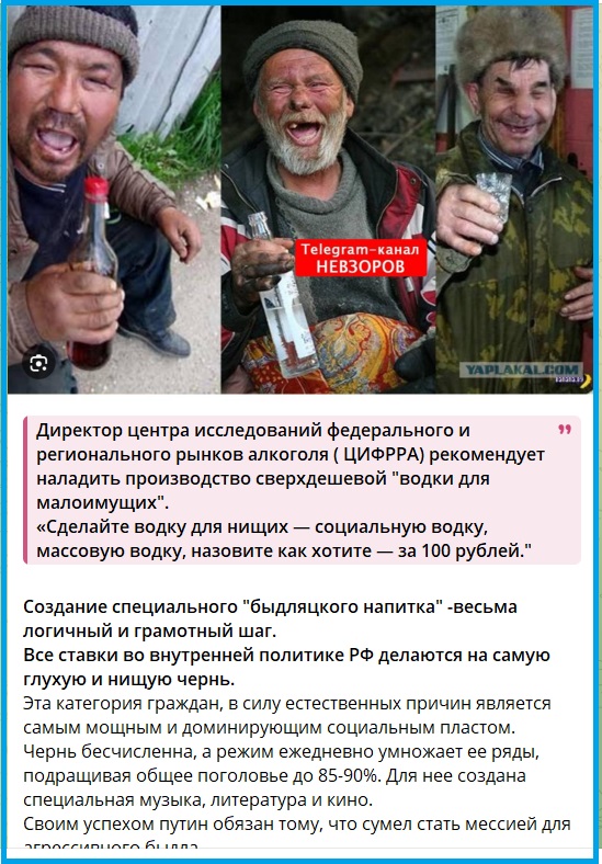 "Створення спеціального "бидляцького напою" - вельми логічний і грамотний крок. Усі ставки у внутрішній політиці РФ робляться на найглухішу та злиденну чернь", - написав автор ТГ-каналу.